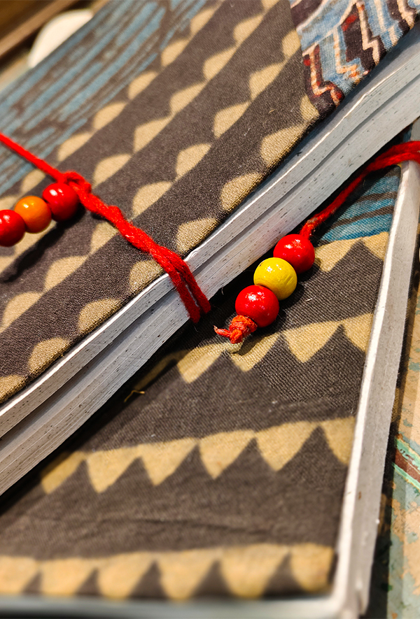Wrapped in bold Ikat fabric with wave and zigzag motifs in black, ochre, and indigo, this notebook is as tactile as it is visual. The red thread closure with wooden beads adds a playful yet rooted accent. Inside, you’ll find handmade paper pages — raw, unruled, and ready to carry your sketches, poetry, or midnight rambles.