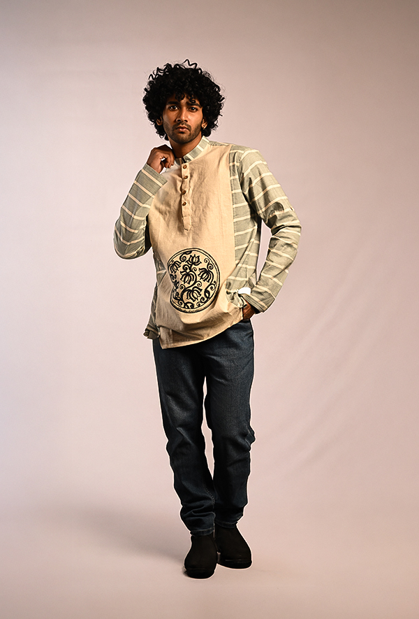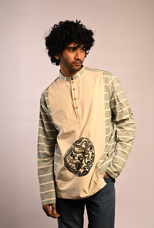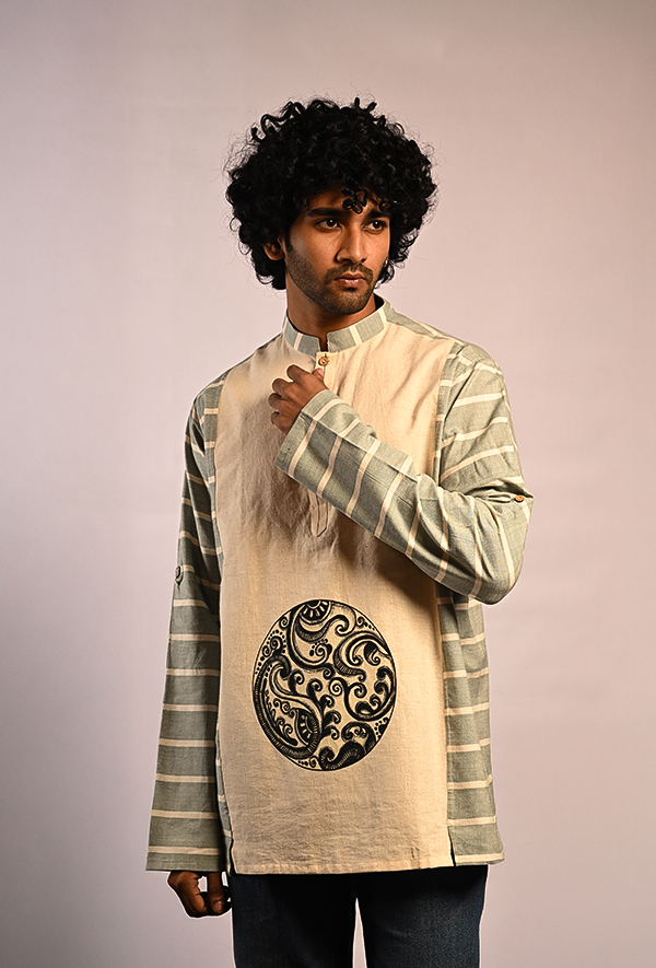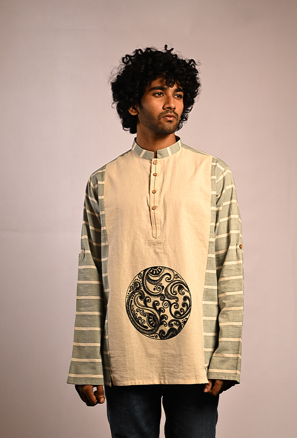 A classic handloom cotton kurta that brings together muted mint green stripes and a hand-printed beige front panel. The centerpiece features a round folk motif inspired by floral medallions—bold, minimal, and timeless. Mandarin collar, wooden buttons, and relaxed fit make it a versatile pick for slow living.