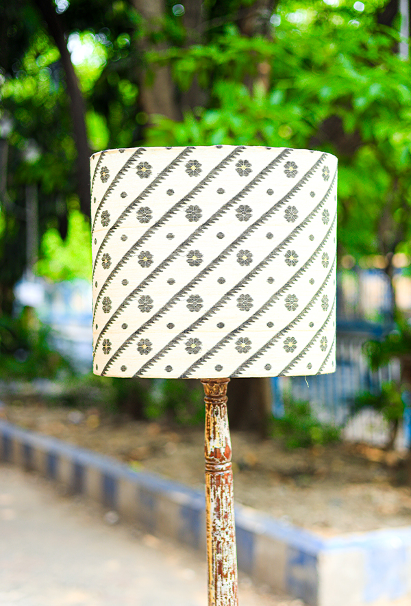 This floor lamp features a spindle-style turned wooden pole in a distressed, weathered finish, with a large drum shade printed in a slanted leaf motif. The off-white base fabric holds black hand block prints arranged in a rhythmic, rising motion. Graceful and rustic all at once.