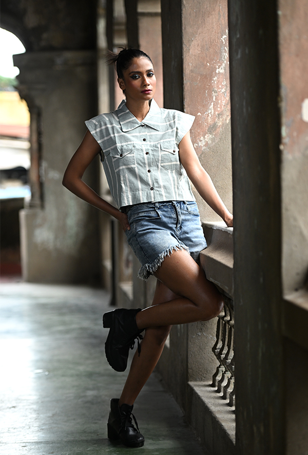 This cropped sleeveless shirt is made from lightweight cotton in muted grey with irregular white stripes. It features wide lapels, a bold shoulder cut, front patch pockets, and wooden buttons. Designed to bring structure to softness.