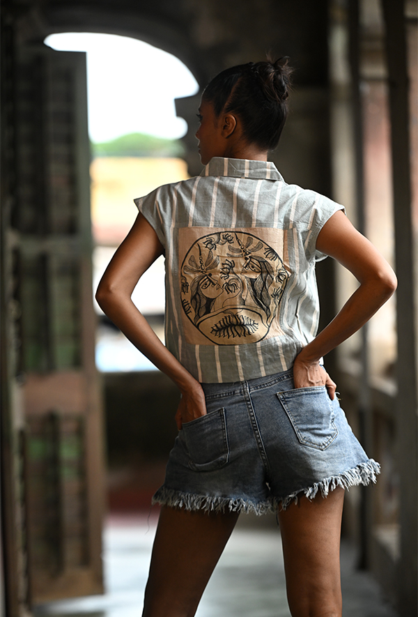 Bold in form, soft in fabric—this cropped shirt walks the thin line between androgyny and attitude. With shoulders like armor and a breeze-friendly cut, it’s made for those who hold their ground with grace. The stripes? Not rules—they’re roadmaps.