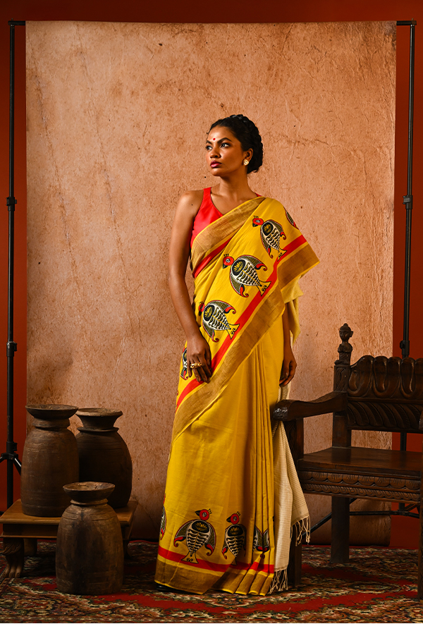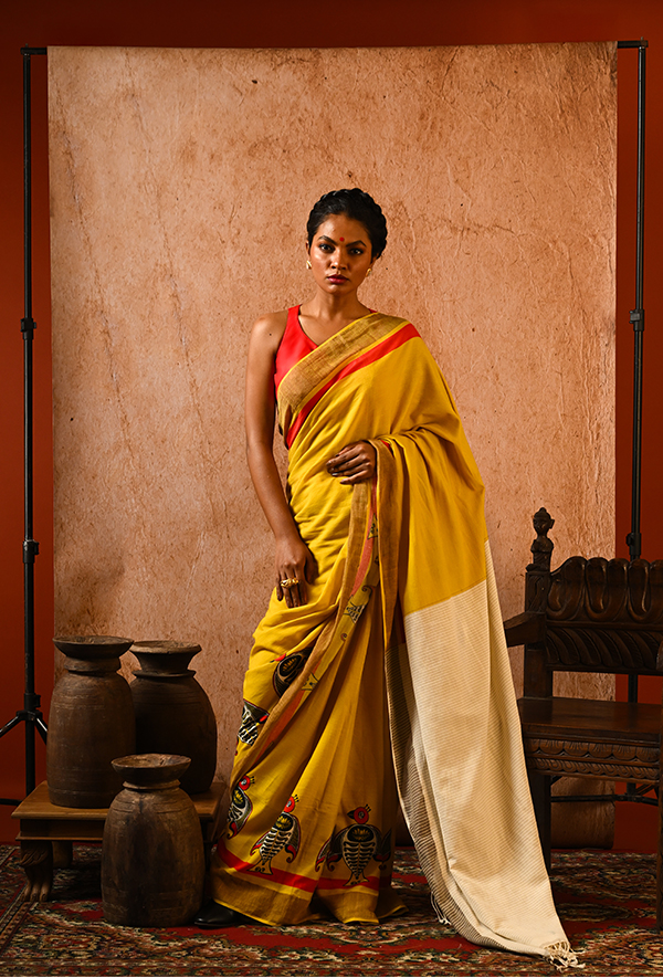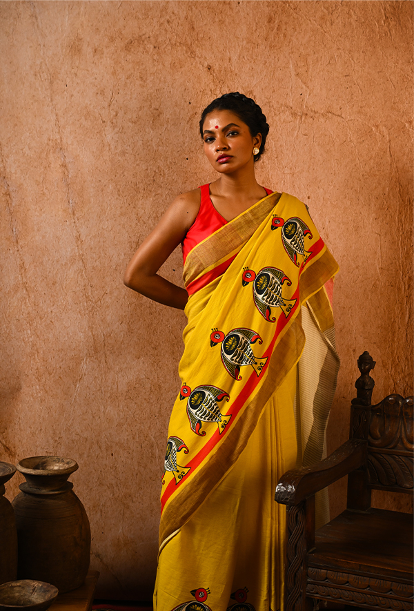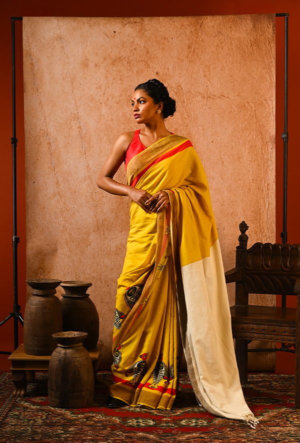 Handwoven in breathable, soft cotton, this sunshine-yellow saree is adorned with traditional bird motifs rendered in bold black with red accents. A bright red-orange border adds structure and drama to the silhouette. The pallu is simple and off-white with fine weaving, allowing the body of the saree to shine. It is a celebration of folk art through contemporary eyes — perfect for summer days and cultural gatherings.