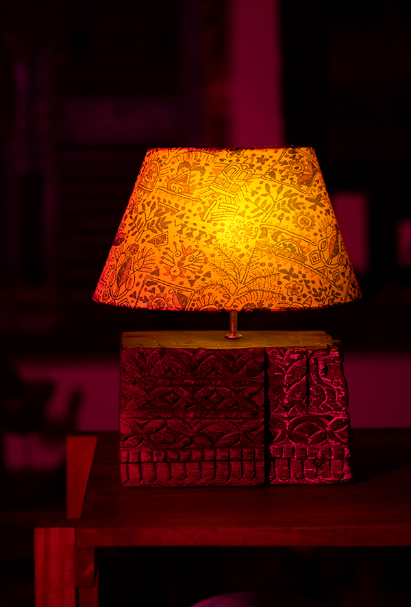 Handcrafted from reclaimed old vintage wooden pieces and adorned with a block-printed cotton lampshade, this piece embodies ancient craftsmanship. The base features intricate temple-inspired carvings, while the ocher shade is a symphony of flora and sacred symbols in black and rust-red inks.
