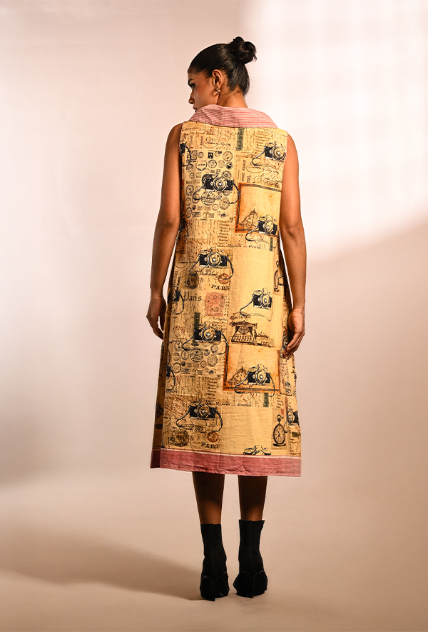 A gentle breeze of nostalgia, this A-line midi dress drapes softly in breathable cotton, with a relaxed cowl neckline and subtle rose trim. Its print is a traveler’s treasure—vintage cameras, postage stamps, and handwritten script evoke distant lands and slower times. Perfect for days meant to be remembered, it’s a dress that captures stories without ever saying a word.