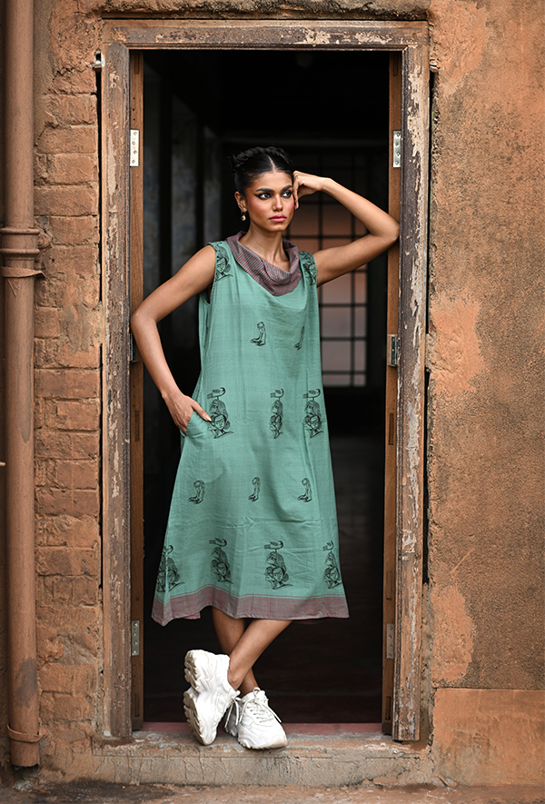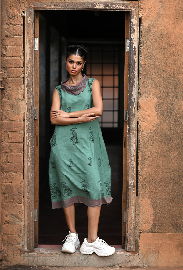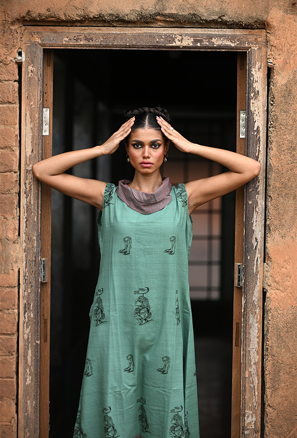 This dress is made of old walls and soft winds. Its shade is not just green—it’s memory washed in moss and sunlight. The prints echo a distant chant, the collar folds like stories pause mid-sentence. It flows not just with the body, but with time.