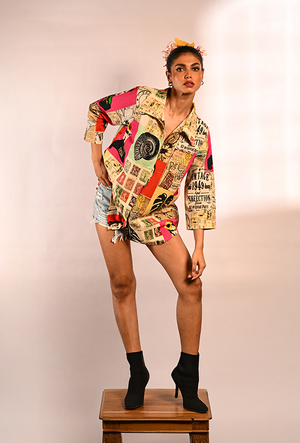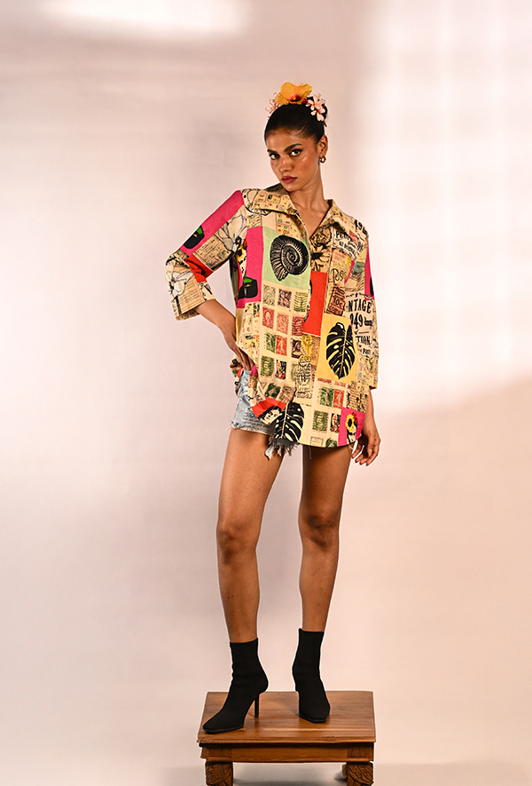 This cotton pop-art shirt is an unapologetic tribute to Frida Kahlo and all things bold, artistic, and defiant. With its oversized fit and drop-shoulder silhouette, it blends comfort with fearless expression. The shirt is a canvas of eclectic visual language—featuring prints of Frida’s portrait, vintage-style stamps, typography, fossils, and abstract motifs, all rendered in a vivid palette of neon pink, mustard, sage, and ink black. It doesn’t just make a fashion statement—it speaks of identity, rebellion, and creative freedom. Whether worn buttoned-up or layered open, this shirt becomes part of your voice—loud, layered, and entirely your own.