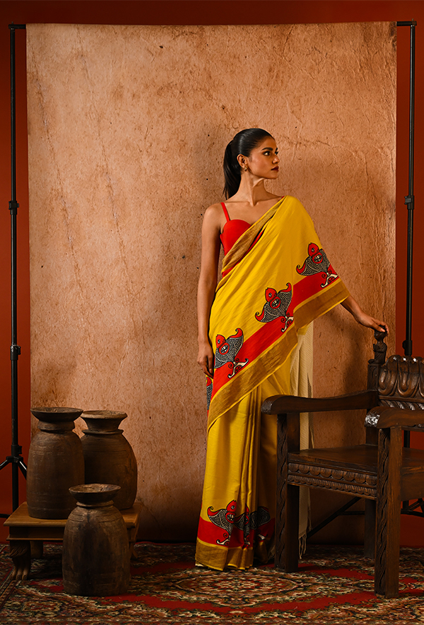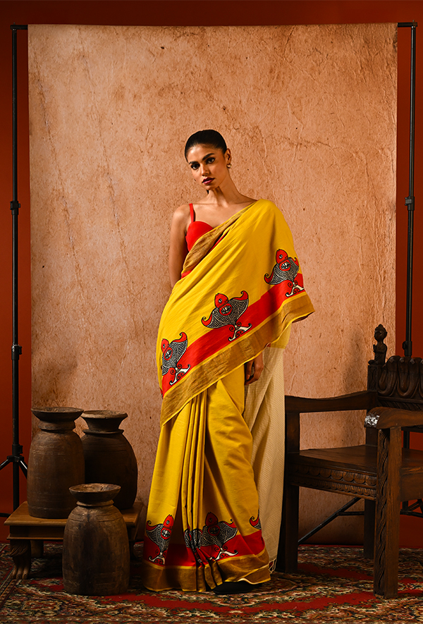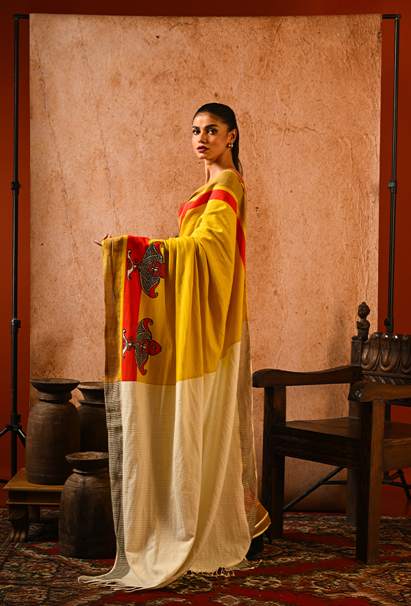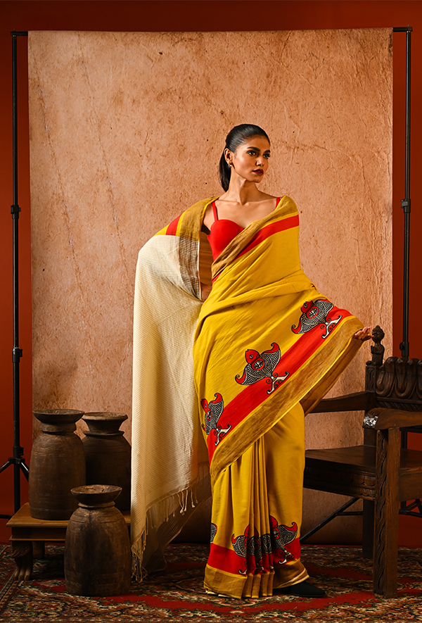 Woven from soft cotton, this mustard yellow saree features single fish motifs hand-blocked in bold black and red, swimming gracefully along a vibrant red border. The pattern is minimalist yet rooted in folk tradition. Paired with a handwoven off-white pallu with fine texture, this piece speaks of simplicity, warmth, and rustic charm. Ideal for sunny mornings, gallery strolls, or soulful adda sessions.
